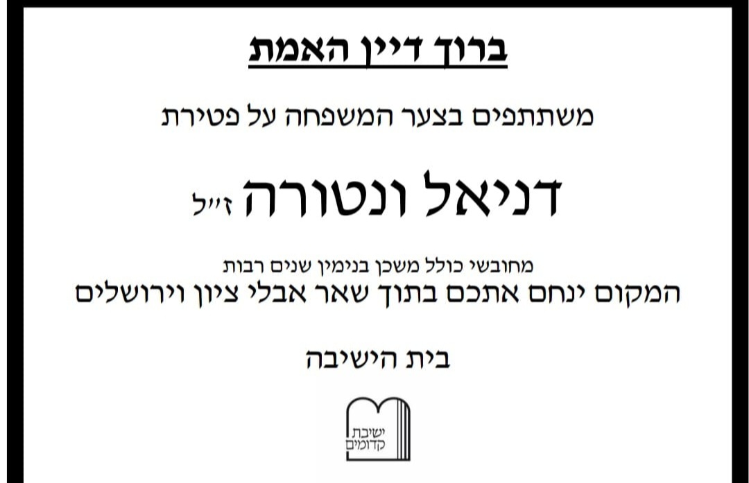 גם בישיבת קדומים הוציאו הודעת הספד על ונטורה אשר למד במשך שנים רבות בכולל גמלאים במקום: "ברוך דיין האמת: משתתפים בצער המשפחה על פטירת דניאל ונטורה ז"ל, מחובשי כולל משכן בנימין שנים רבות, המקום ינחם אתכם בתוך שאר אבלי ציון ירושלים".
