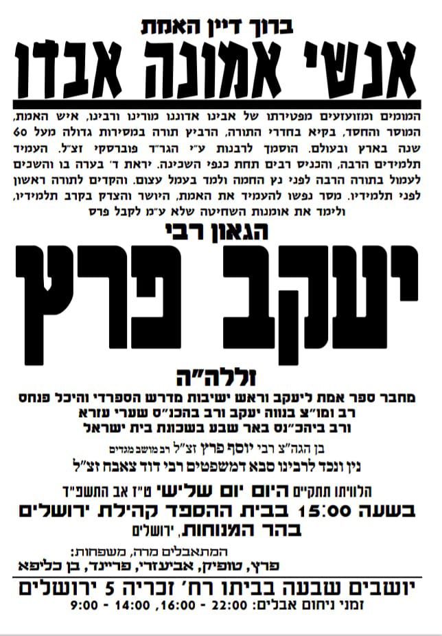 הלך לעולמו הרב יעקב פרץ, ראש ישיבות 'אור חברון' בקרית ארבע, 'מדרש הספרדי' ו'היכל פנחס', בן 88. הרב פרץ היה מחבר סדרת הספרים "אמת ליעקב".