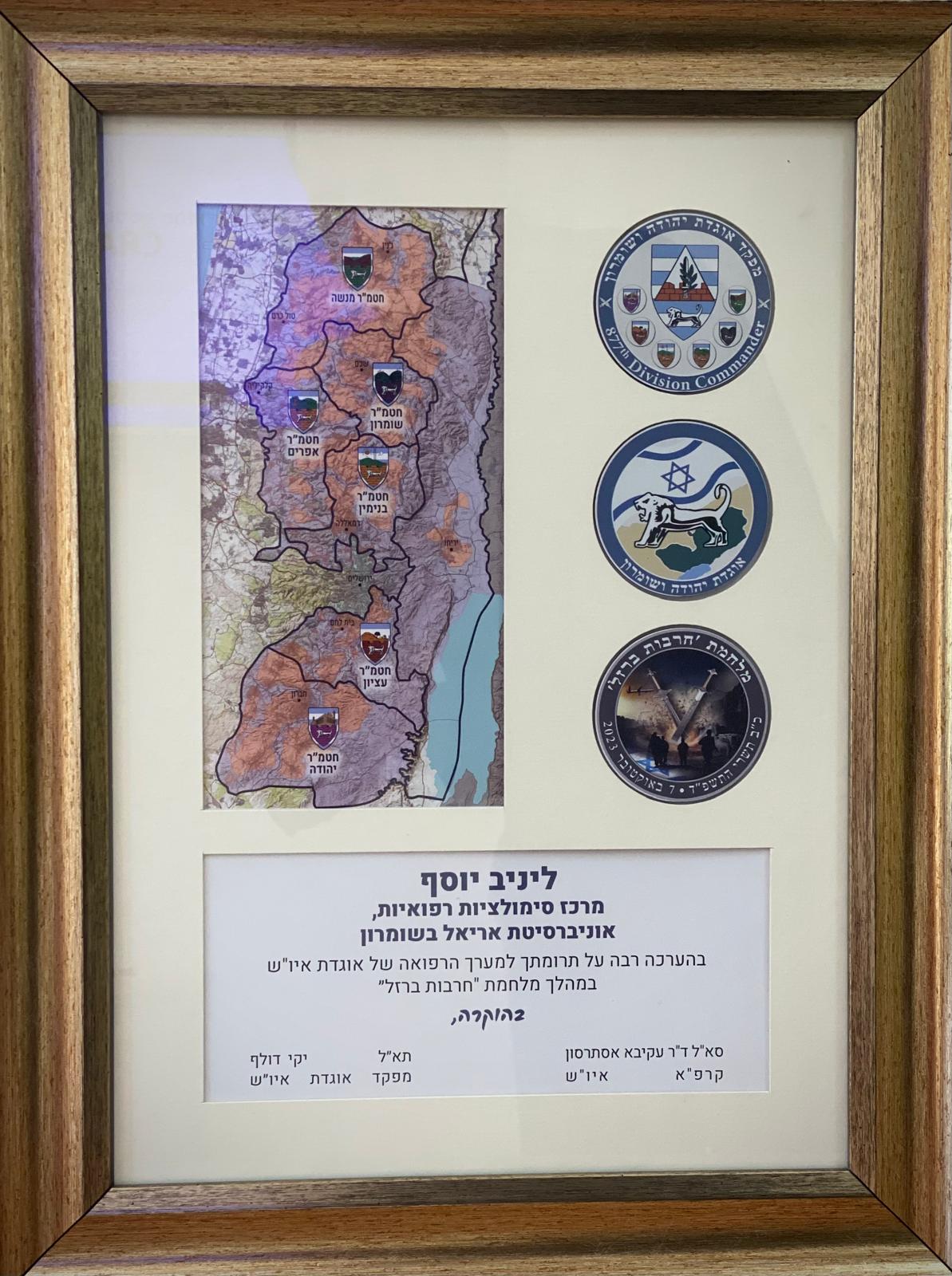 אוגדת איו"ש העניקה תעודת הוקרה ליניב יוסף, מנהל המרכז לסימולציות רפואיות באוניברסיטת אריאל ע"ש רות וקונרד מוריס, על תרומתו למערך הרפואה של האוגדה במהלך מלחמת 'חרבות ברזל'.