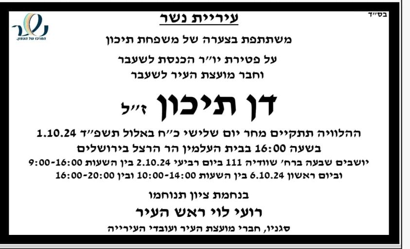 הלוויתו של תיכון תתקיים מחר, יום שלישי, בשעה 16:00 בבית העלמין בהר הרצל.