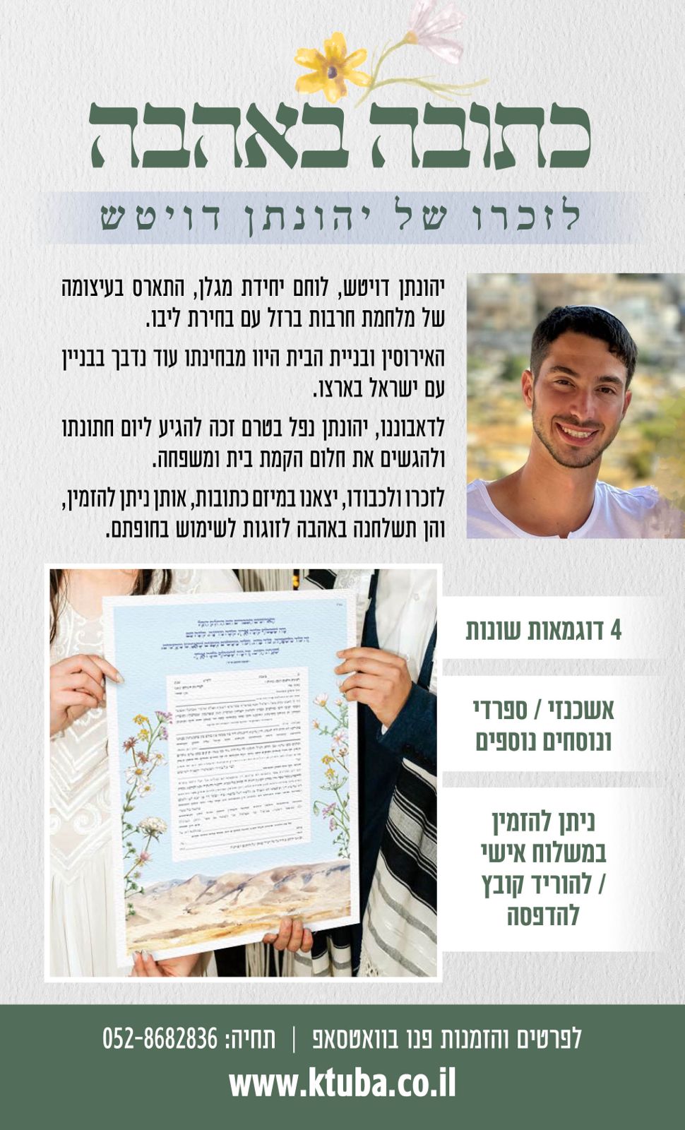 יהונתן דויטש התארס בעיצומה של המלחמה, ואז נהרג בפיגוע. כעת יוצאת משפחתו במיזם כתובות לזכרו. משפחתו הדפיסה למעלה מאלפיים כתובות יפות לחופה והם נשלחות לזוגות לשימוש בחתונתם.
