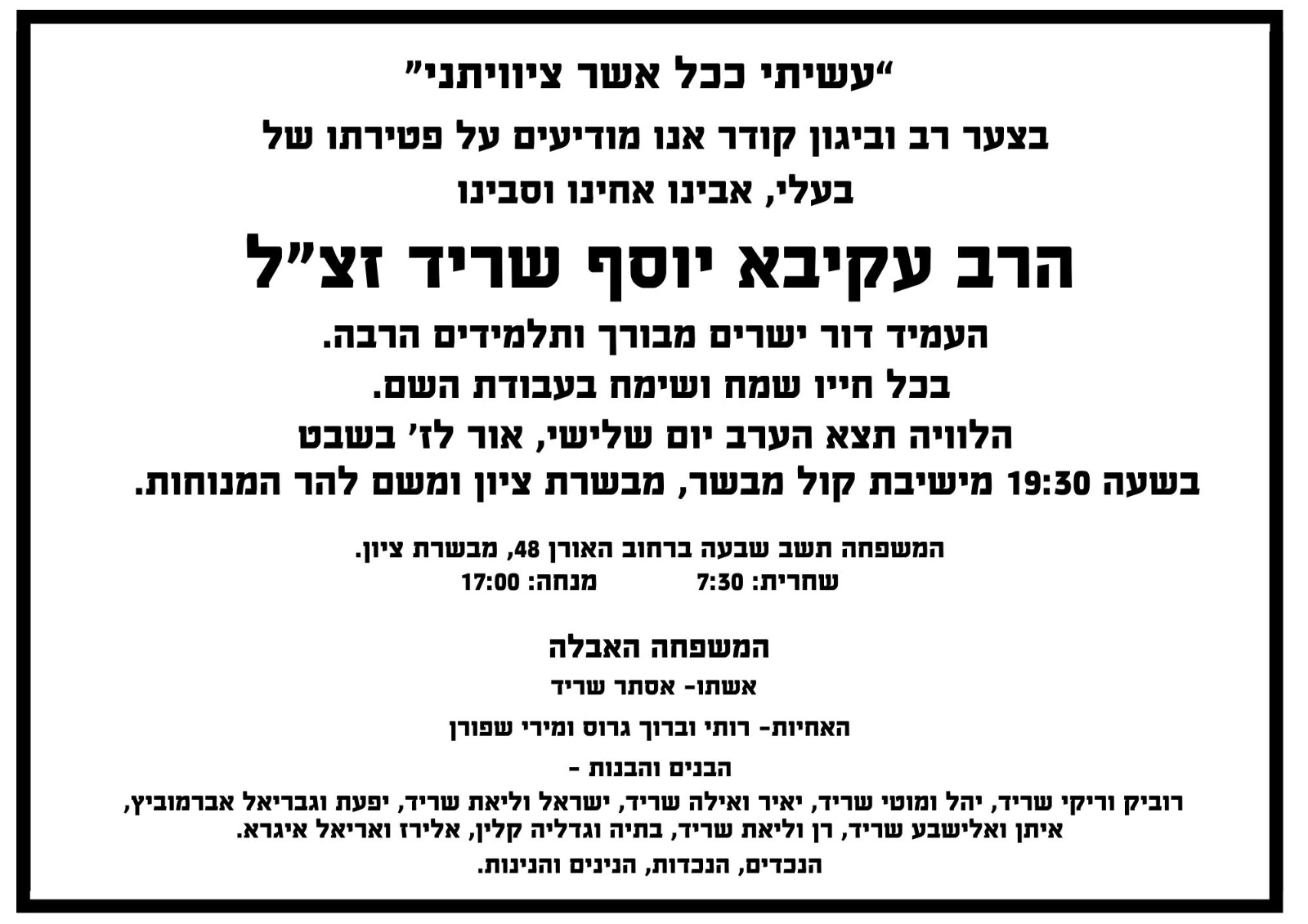 בנו רן שריד, ספד לו: "נצחו אראלים את המצוקים, אבינו מורנו נפטר אחרי מחלה קצרה. ברוך דיין האמת". הרב למד בכרם ביבנה והיה שותף גם להקמת ישיבת בית יהודה בכפר מימון.