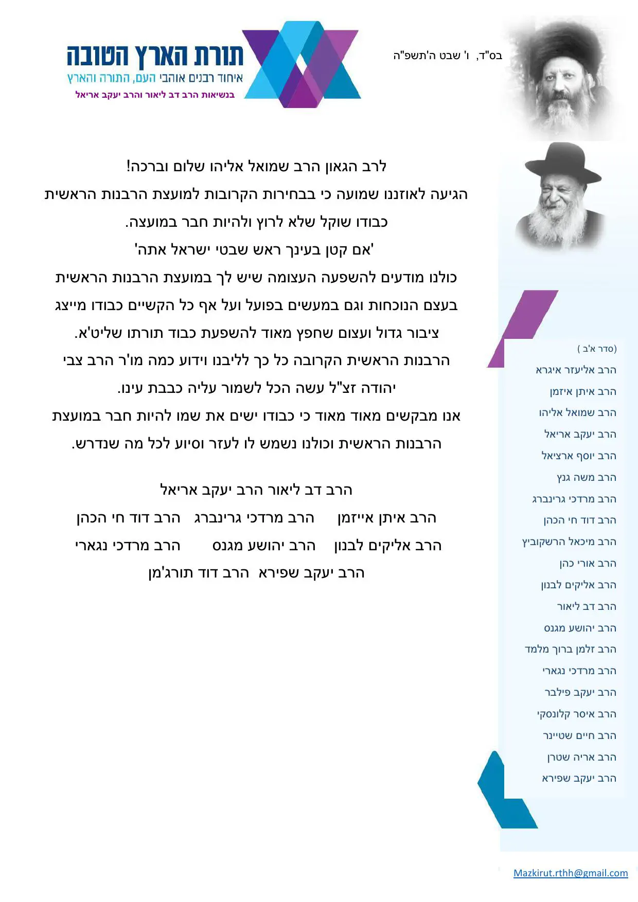 עוד הוסיפו: "הרבנות הראשית קרובה כל כך לליבנו וכידוע כמה מו"ר הרב צבי יהודה זצ"ל עשה הכל לשמור עליה כבבת עינו. אנו מבקשים כי כבודו ישים את שמו להיות חבר במועצת הרבנות הראשית וכולנו נשמש לו לעזור ולסיוע בכל מה שנדרש".