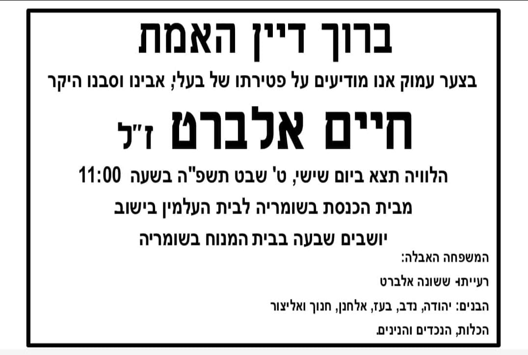 הלווייתו תצא היום (שישי) בשעה 11:00 מבית הכנסת בשומריה לבית העלמין ביישוב. יושבים שבעה בבית המנוח בשומריה.