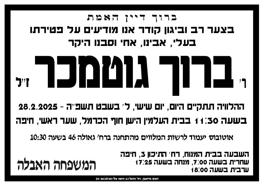 "בצער רב וביגון קודר אנו מודיעים על פטירתו של בעלי, אבינו, אחי וסבנו היקר ר' ברוך גוטמכר ז"ל", כתבו במשפחתו.