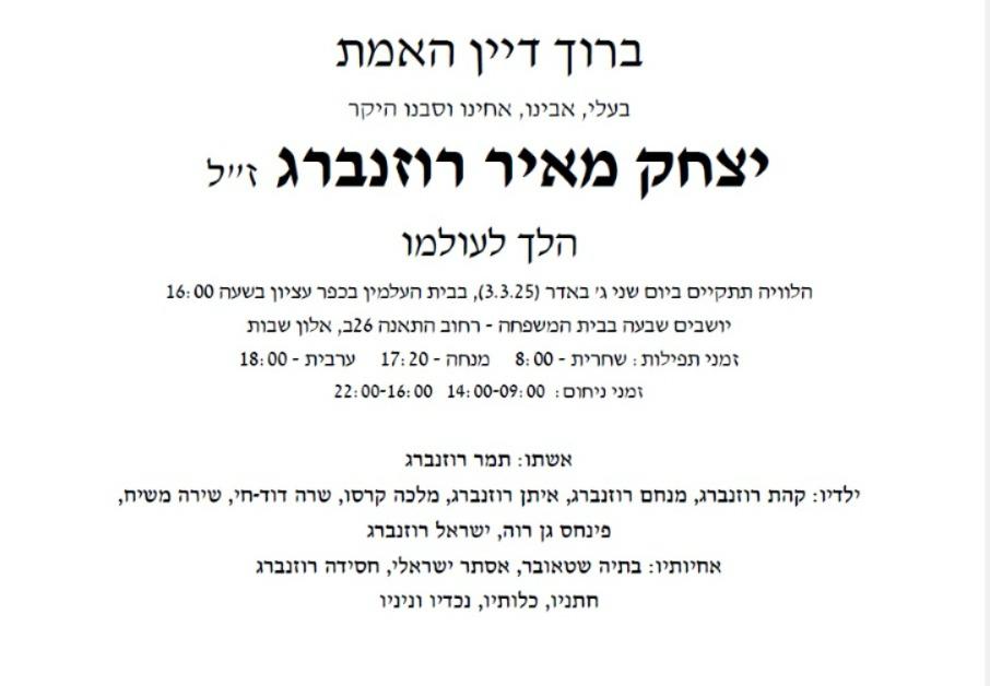 הלך לעולמו יצחק (איצ'ה) מאיר רוזנברג, מוותיקי היישוב אלון שבות, סופר סת"ם נודע וחתנו של הרב פנחס קהתי זצ"ל, מחבר הפירוש למשניות.