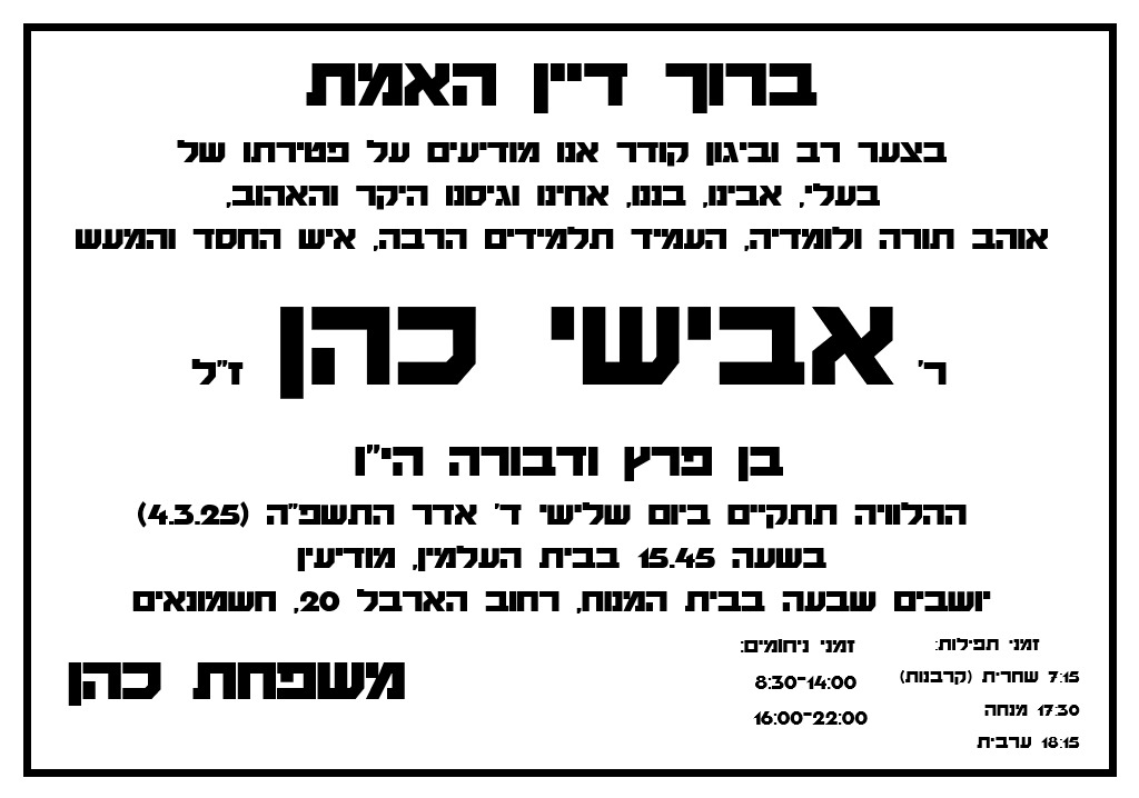 "ברוך דיין האמת, בצער רב וביגון קודר אנו מודיעים על פטירתו של בעלי, אבינו, בננו, אחינו וגיסנו היקר והאהוב, אוהב תורה ולומדיה, העמיד תלמידים הרבה, איש החסד והמעש, ר' אבישי כהן ז"ל, בן פרץ ודבורה הי"ו", נכתב במודעת האבל.