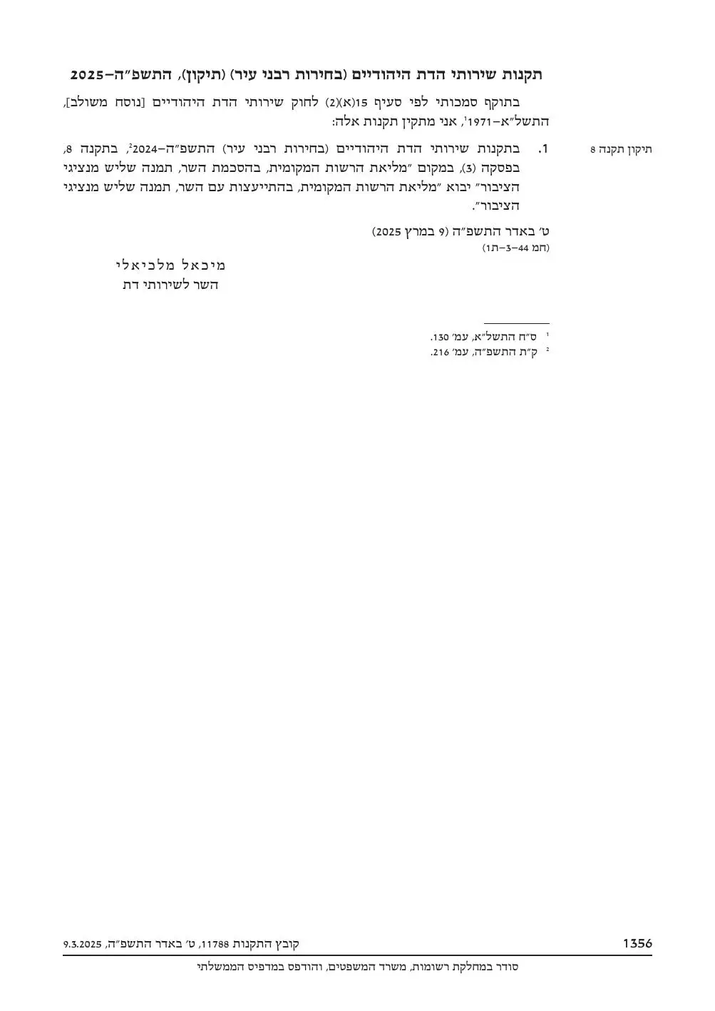 המשרד לשירותי דת נדרש להשיב לעתירה עד 20 במרץ 2025, אך השר לשירותי דת, מיכאל מלכיאלי, הודיע כי הוחלט לצמצם משמעותית את התקנות ולהחזיר לרשויות המקומיות את הסמכות המרכזית בנושא. בהתאם לשינוי המרכזי בנוסח, הרשות המקומית תמנה שליש מנציגי הציבור "בהתייעצות עם השר" במקום "בהסכמת השר".