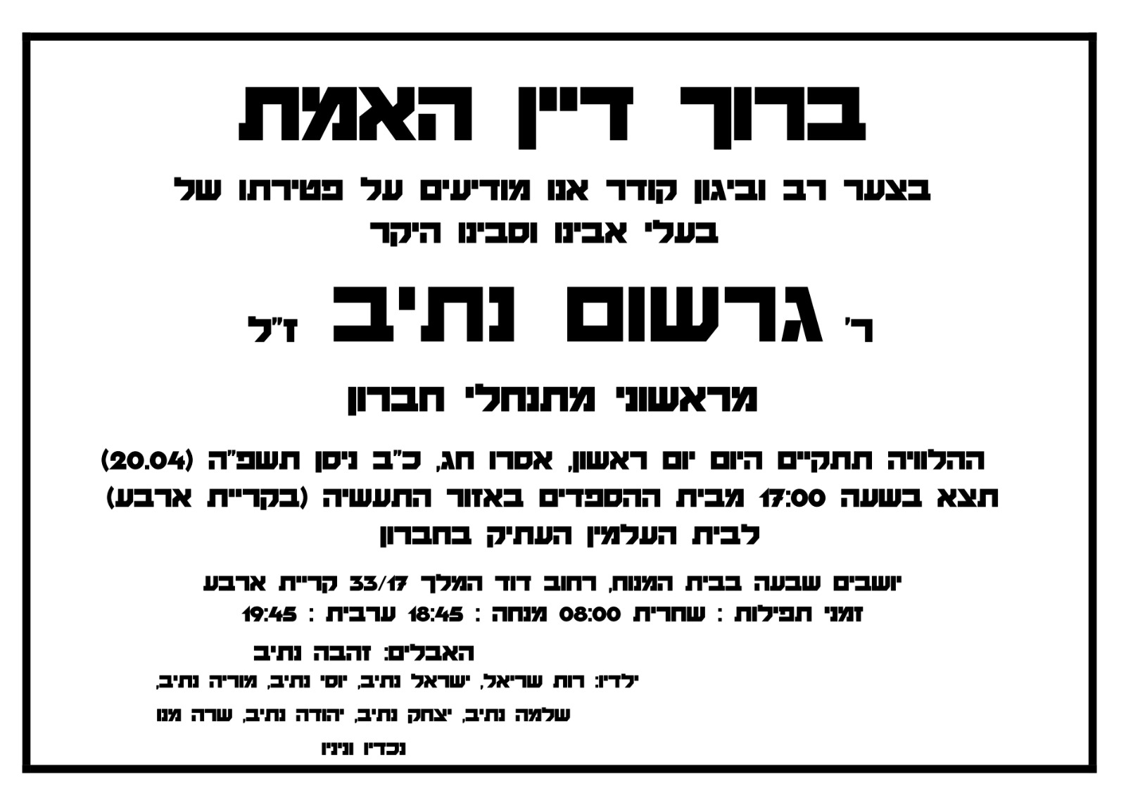 "ברוך דיין האמת - בצער רב וביגון קודר אנו מודיעים על פטירתו של בעלי אבינו וסבינו היקר ר' גרשום נתיב, מראשוני מתנחלי חברון", נכתב בהודעת האבל.