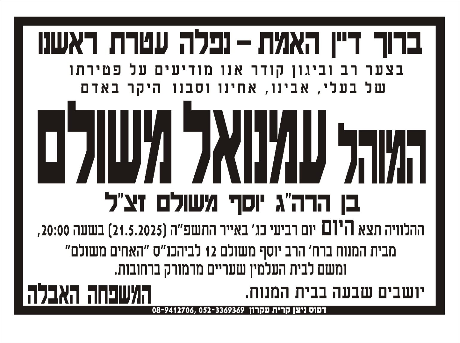 ראש העיר רחובות, מתן דיל, כתב בדף הפייסבוק שלו: "עמנואל לא היה רק מוהל. הוא היה אדם שכולו חסד, ענווה ואהבת הזולת. עשרות שנים, ובכל ימות השנה, קיים את מצוות המילה, שאותה למד מאביו, הרב יוסף משולם זצ"ל. תמיד בחיוך ובנעימות ומתוך תחושת שליחות, תמיד ללא כל תמורה, וגם כשהזוג התעקש לשלם, היה מפנה אותם להפוך את התמורה לתרומה. זכיתי להכיר את עמנואל מקרוב".