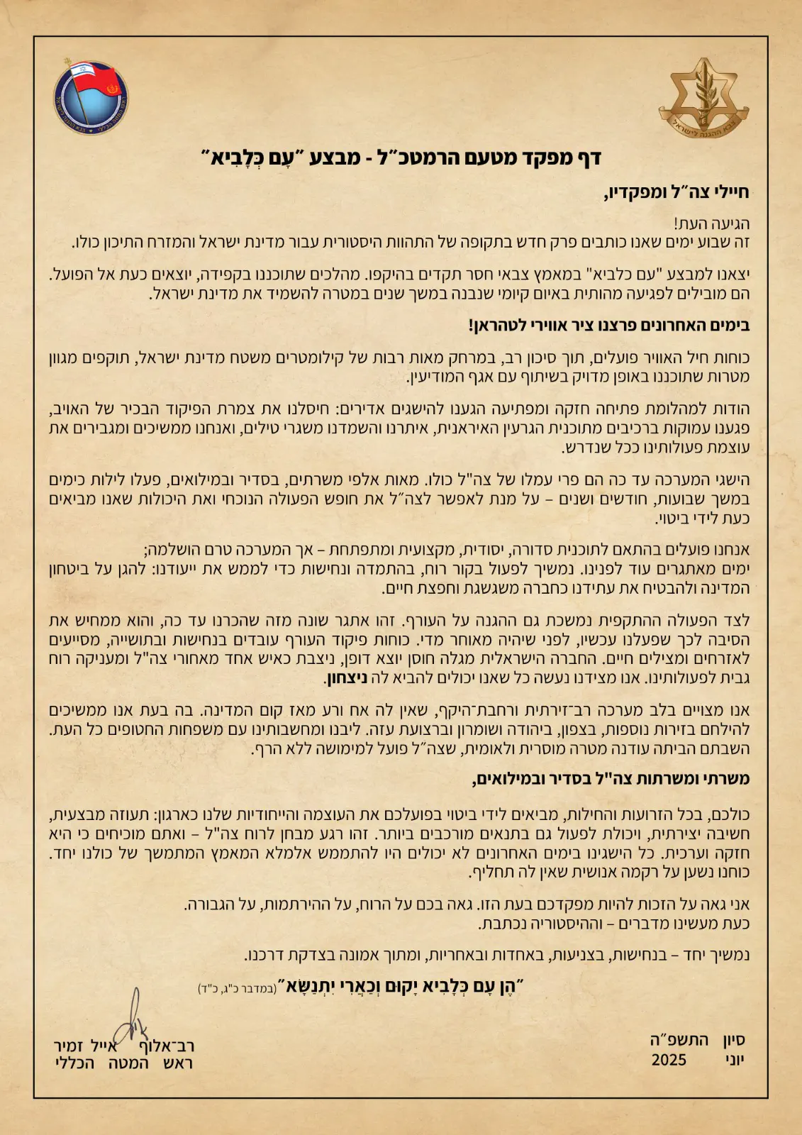 הוא התייחס לעומק ולמשמעות של מבצע "עם כלביא", המתנהל מול איראן. במכתב הדגיש הרמטכ"ל את מורכבות המערכה והישגיה הבולטים, וקרא לכוחות להמשיך לפעול באחריות, בנחישות ובאמונה בצדקת הדרך.