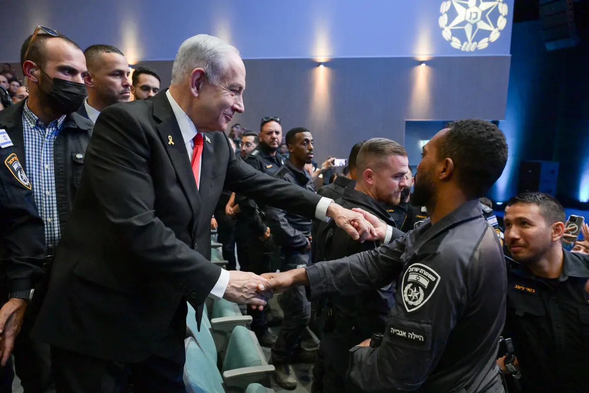 נתניהו אמר: "בשבעה באוקטובר אתם הייתם בקו הראשון. הרבה פעמים אתם הייתם ה-קו הראשון. אני התרשמתי עמוקות מהגבורה וההקרבה של שוטרות שנפלו בקרב, ושוטרים שנפלו בקרב, ועצרו בגופם את המפלצות האלה. זה עשה רושם כביר לא רק עליי ולא רק על אזרחי ישראל, אלא על העולם כולו".