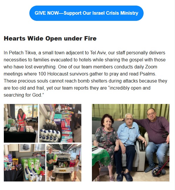 בהודעה ששלחו באחד הארגונים לתורמים שלהם נכתב בנוגע לעיר פתח תקווה כי "הצוות שלנו מספק באופן אישי מצרכים חיוניים למשפחות שפונו למלונות, תוך שהוא חולק את הבשורה עם אלו שאיבדו את הכל".