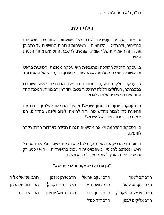 הרבנים מדגישים כי הם "עומדים לצידם של משפחות החטופים, משפחות הנרצחים, ולהבדיל הלוחמים, משפחות גיבורות הנושאות על כתפיהן את רוחה האמיתית של האומה, וקוראים להשבת החטופים מתוך הכנעת האויב".