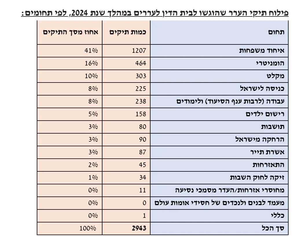 על פי הנתונים, בשנת 2024 נפתחו 2,943 עררים בבית הדין לעררים ונסגרו 3,080 תיקים. הנושאים השכיחים ביותר: איחוד משפחות (41%), עניינים הומניטריים (16%), בקשות מקלט (10%), כניסה לישראל (8%) ועבודה ולימודים (8%). 95% מהעררים נפתחו באופן מקוון - נתון המעיד על אימוץ רחב של ההליך הדיגיטלי.