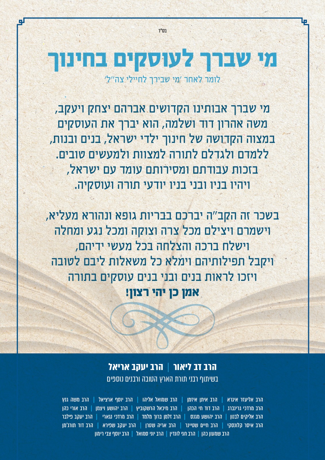 לדברי הרבנים, "פתיחת שנת הלימודים היא לא רק חג לילדים ולהורים, אלא גם קריאה ציבורית להתגייסות. זה הזמן להצטרף לשורות ההוראה, לקחת חלק במשימה הלאומית של חינוך ילדי ישראל, ולבנות כאן חברה ערכית ואיתנה".