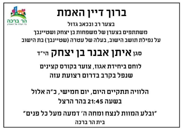 עטרה היקרה, בת למשפחה שורשית בהר ברכה, שגדלה כאן, הביאה אותו לכאן לשומרון ועכשיו אנחנו צריכים ללוות אותו בדרכו האחרונה. כולנו המועצה והישוב נלווה את משפחות בן יצחק ושטיינבך, בכל מה שניתן בשעה הקשה הזו. נתחזק יחד ולעולם לא נשבר, אנחנו כאן כדי לבנות את הארץ ולנצח".