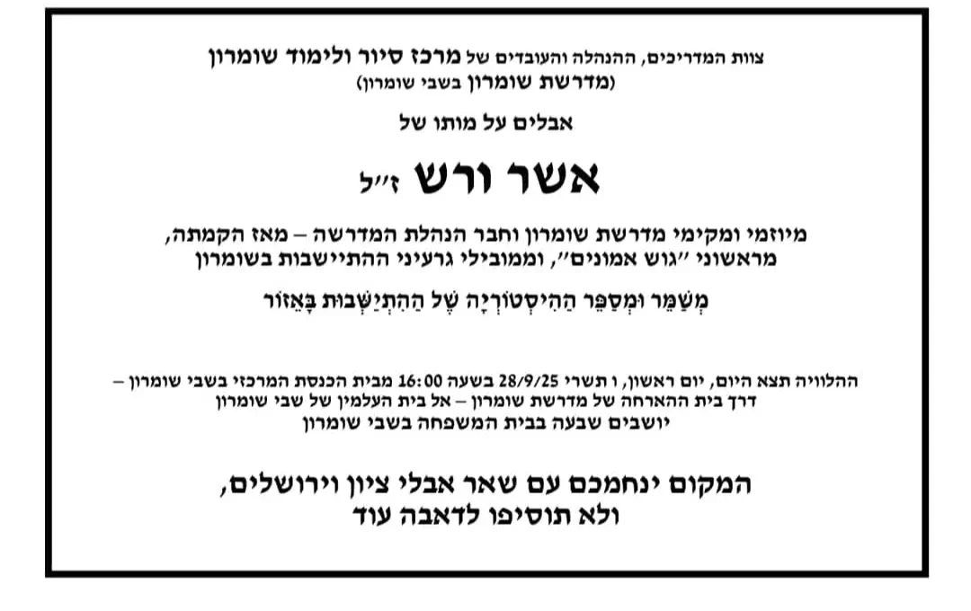 צוות מדרשת שומרון בשבי שומרון הודיע על פטירתו של אשר ורש ז"ל, מיוזמי ומקימי המדרשה וחבר הנהלתה מאז הקמתה. אשר היה מראשוני "גוש אמונים" וממובילי גרעיני ההתיישבות בשומרון.