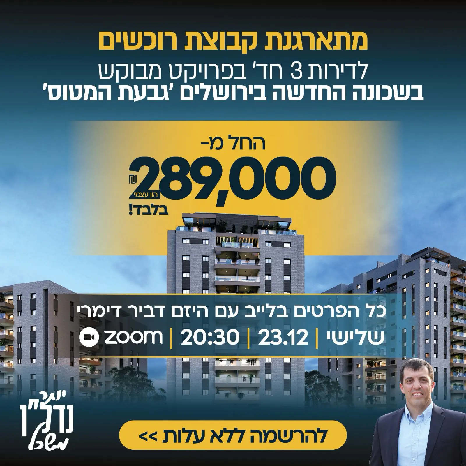 הלייב יתקיים ביום שני, 3 בנובמבר, בשעה 20:30. 15 דירות, תנאים של הון עצמי מ-289,000 ש"ח, ופטור ממדד. אחרי 3 בנובמבר - אין ערבות שהתנאים האלה יישארו.