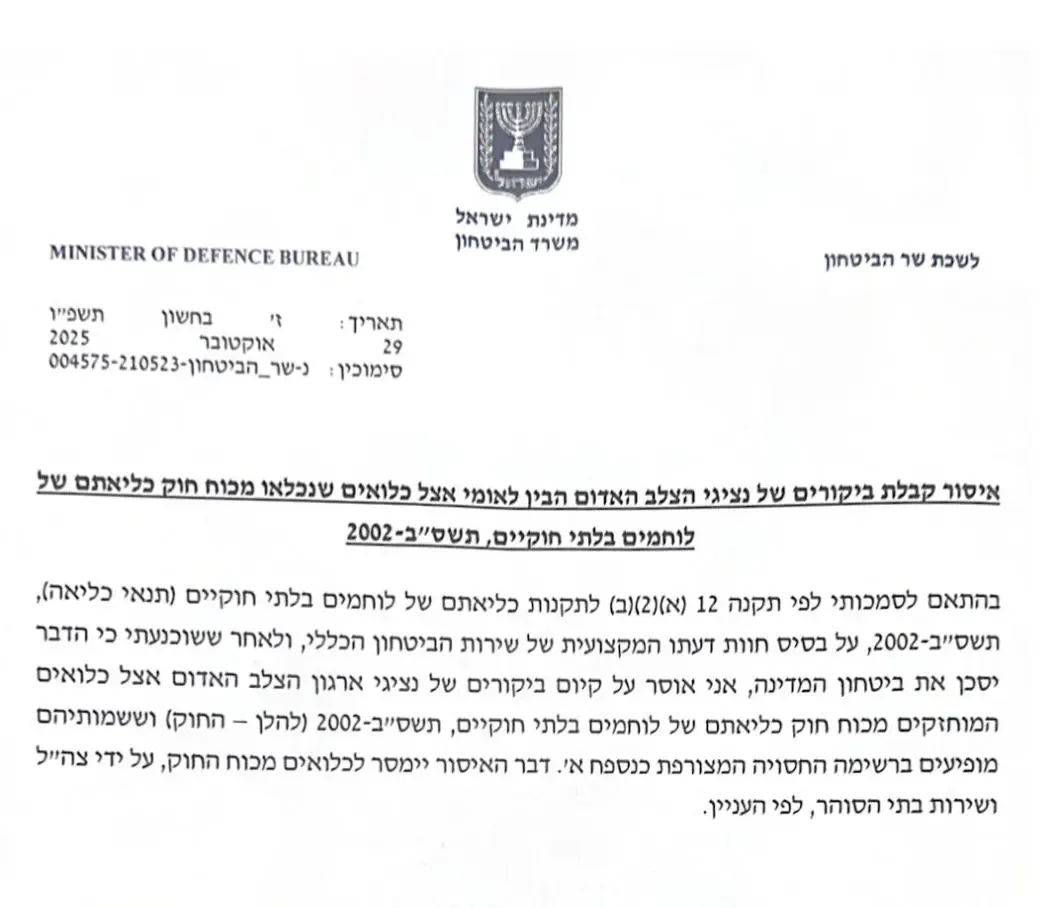 שר הביטחון ישראל כ"ץ חתם היום (רביעי) על צו מיוחד האוסר את כניסת נציגי הצלב האדום הבינלאומי לבתי הכלא לצורך ביקורים אצל מחבלים, לרבות אלו המוגדרים "נוח'בות" וכלואים לפי חוק כליאתם של לוחמים בלתי חוקיים.