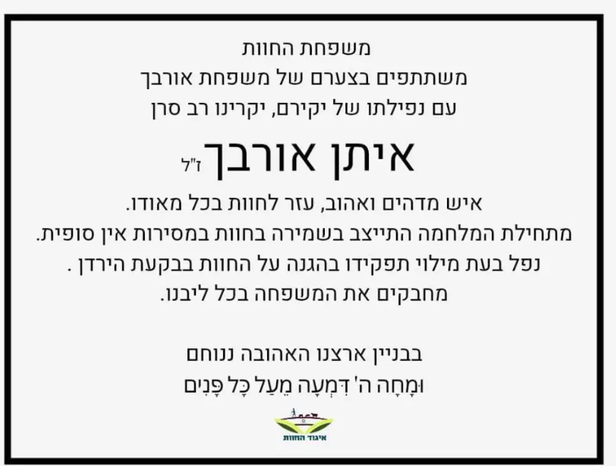 רס"ן איתן אורבך נהרג (שישי) בתאונת דרכים מבצעית בעת מילוי תפקידו בהגנה על חוות בקעת הירדן.