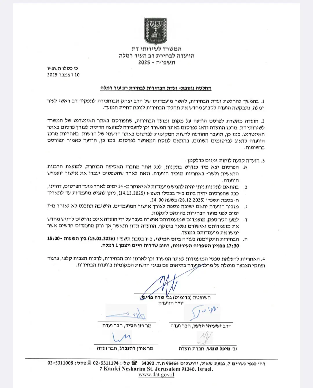 כעת קבעה הוועדה כי הליך הבחירות יחודש, תוך פרסום הודעה רשמית על מקום ומועד הבחירות באתר האינטרנט של המשרד לשירותי דת, וכן באמצעות המועצה הדתית, הרשות המקומית ופרסום ברשומות, בהתאם לנוסח שאושר.