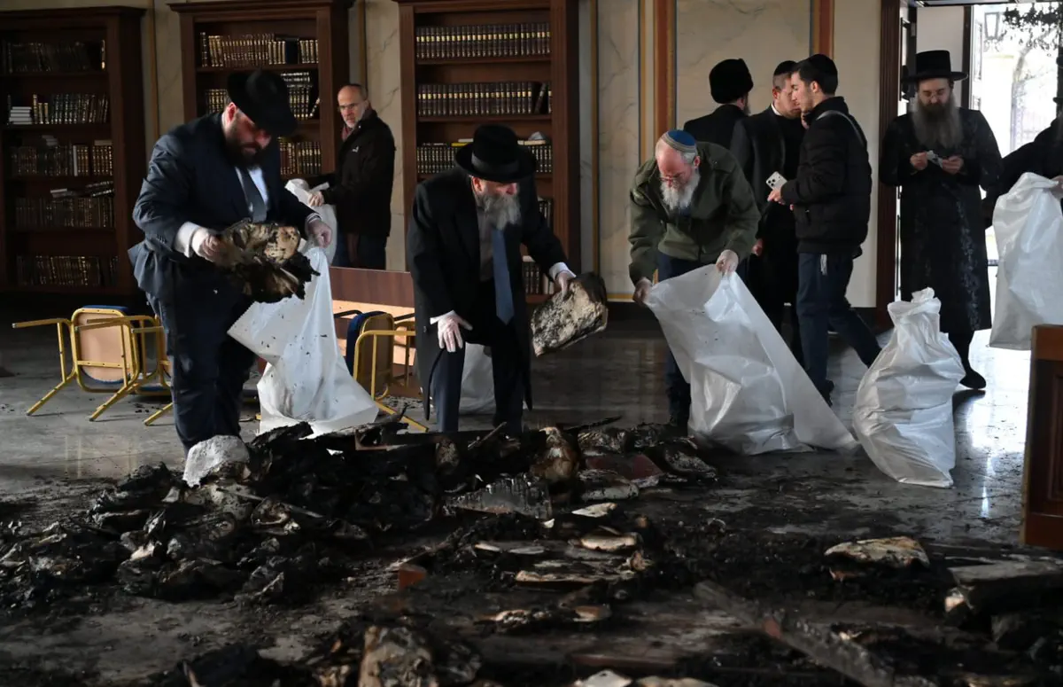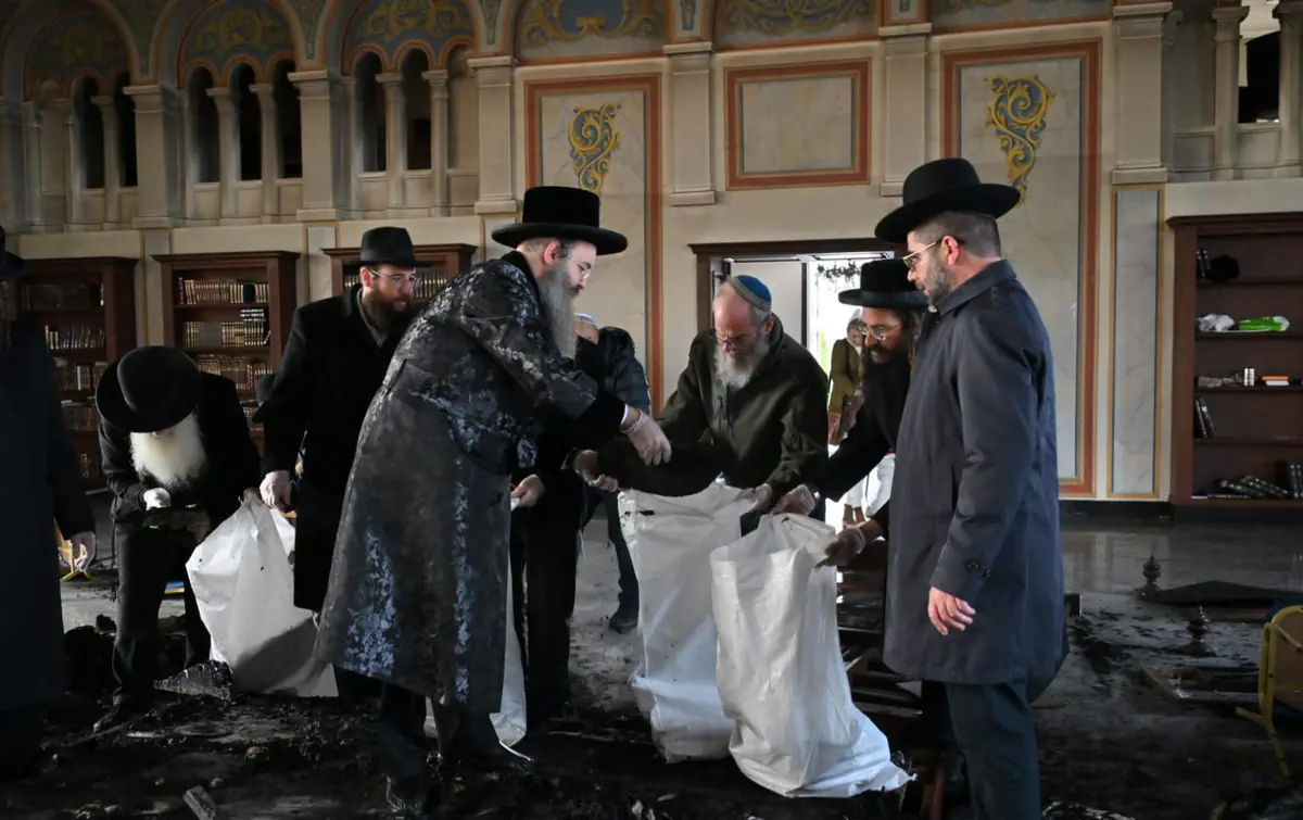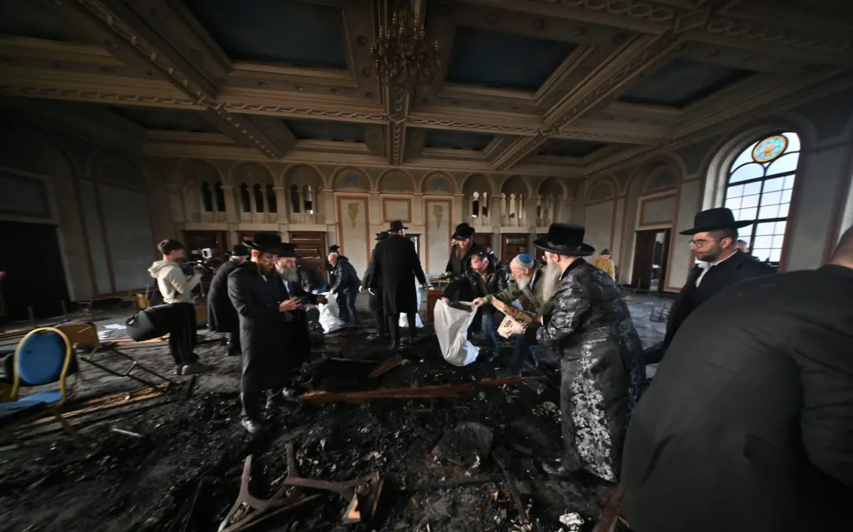 השריפה פרצה בשבוע שעבר בבית הכנסת המכונה "קלויז קדישא", מבנה בן 200 שנה ששימש מרכז רוחני מרכזי של החסידות. בחקירה ראשונית עלה חשד כי מדובר בהצתה ממניע אנטישמי.
