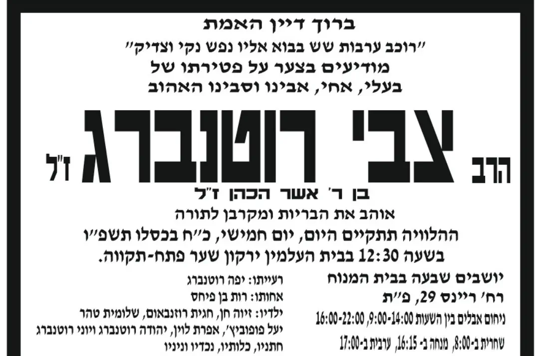 הרב צבי רוטנברג, רב קהילת עלומים בכפר אברהם שבפתח תקווה, הלך לעולמו. הלווייתו תתקיים בשעה 12:30 בבית העלמין ירקון.