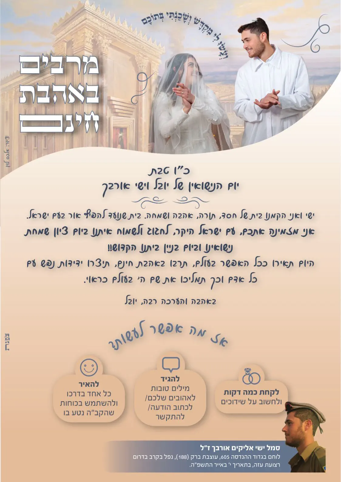 יובל אורבך, אלמנתו של ישי אליקים אורבך ז"ל שנפל בעזה לפני כשמונה חודשים, פונה לציבור בישראל ביוזמה לציון יום הנישואין הראשון שלה ושל בעלה מאז נישאו.