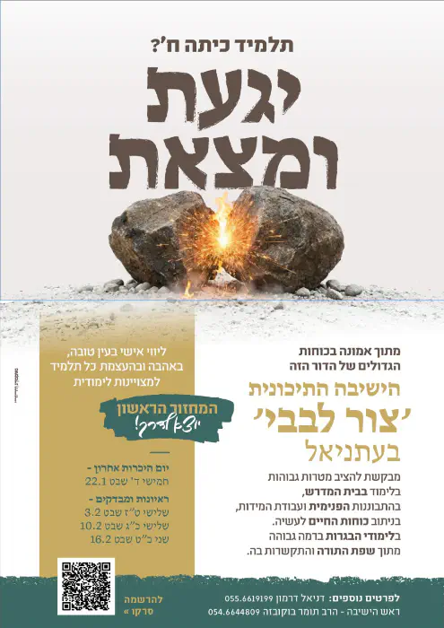 אז למי הישיבה החדשה מיועדת? "אנחנו מכוונים לחבר'ה שיודעים לגייס את עצמם ללמידה. תלמידים עם שאיפות גבוהות. לאו דווקא תלמידים עם הממוצע הכי גבוה בתעודה, אבל כאלה ש'באים לעבוד'. תלמיד רציני שיודע להציב לעצמו מטרות ויעדים - ולעמוד בהם. חלק מהסיבות שקראנו לישיבה 'צור לבבי' היא על שם אבן הצור. היא נראית כמו אבן רגילה, אבל מי שמבין יודע שאפשר להוציא ממנה אש. מחנך, בעיניי, הוא האדם הזה. שלא עובר ליד האבן, אלא מבין שאפשר להדליק אש באבן הזאת. הווי אומר: לסייע לתלמיד 'להדליק' את עצמו. אם יש לתלמיד רצון - אנחנו בע"ה נפתח לו את השרירים".