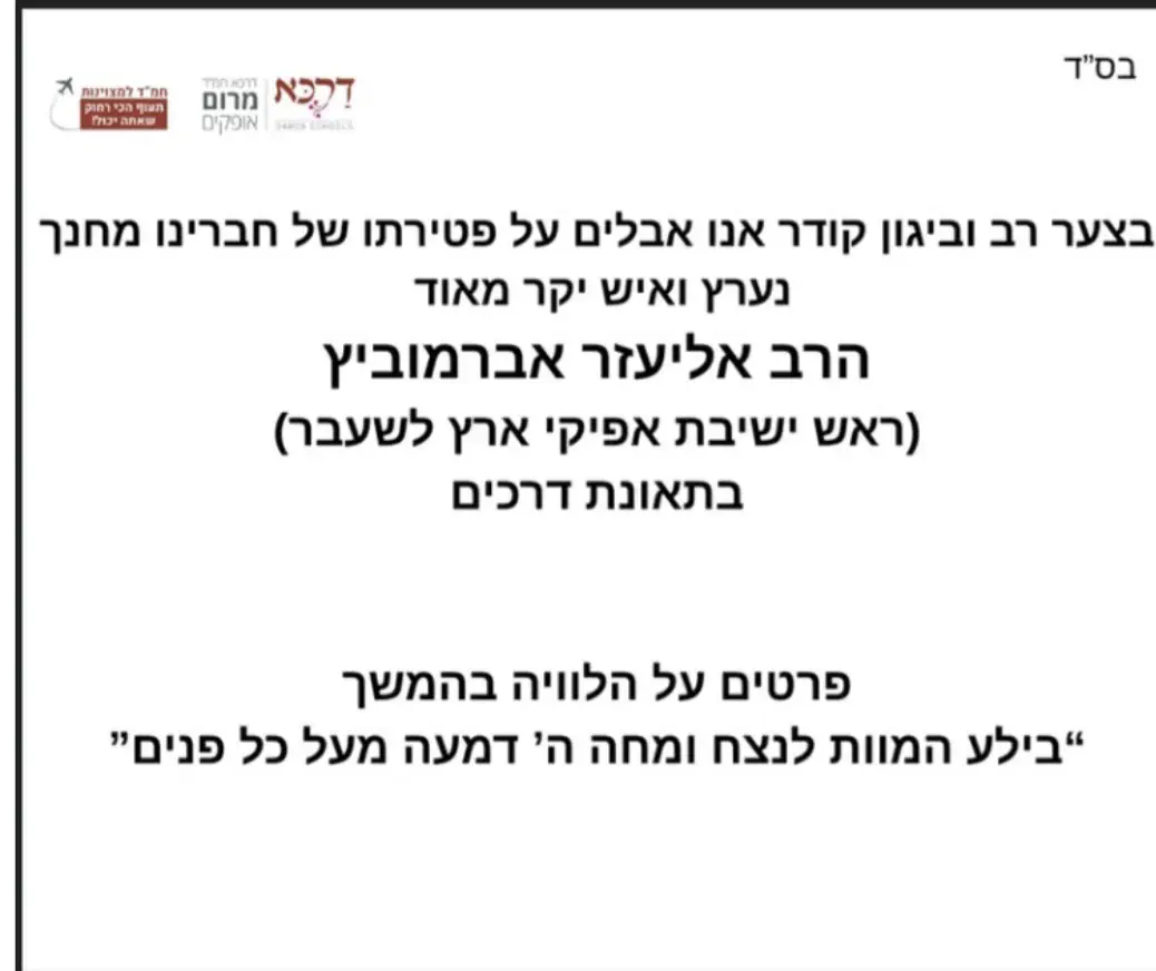 מהישיבה נמסר: "בצער רב וביגון קודר אנו אבלים על פטירתו של חברינו מחנך נערץ ואיש יקר מאוד הרב אליעזר אברמוביץ, ראש ישיבת אפיקי ארץ לשעבר, בתאונת דרכים. "בילע המוות לנצח ומחה ה' דמעה מעל כל פנים".