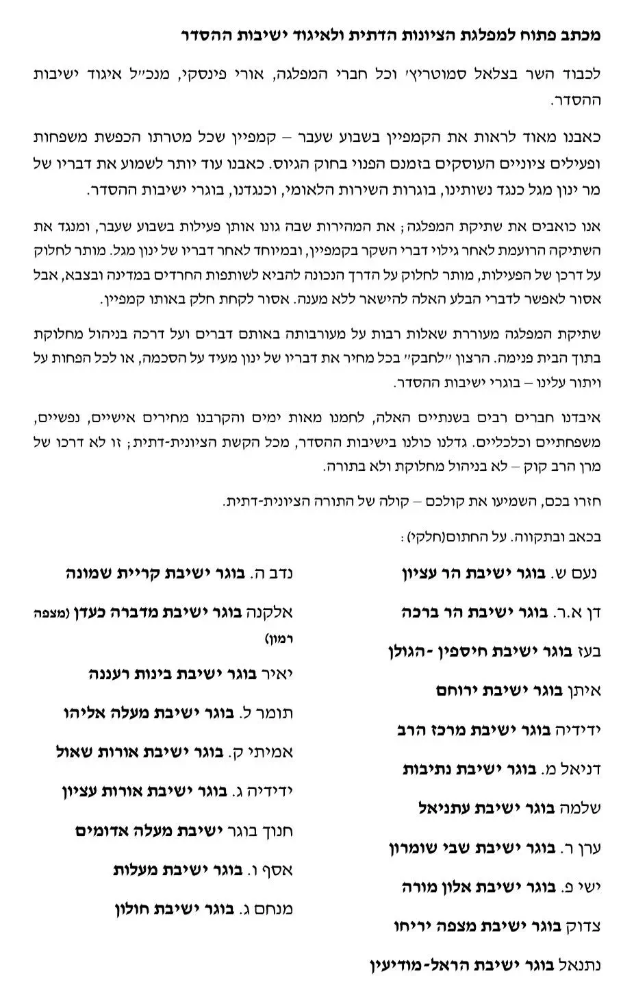 בוגרי ישיבות הסדר ומשפחות ציוניות פרסמו מכתב פתוח המופנה לשר בצלאל סמוטריץ', לחברי מפלגת הציונות הדתית ולמנכ"ל איגוד ישיבות ההסדר, אורי פינסקי. במכתב הם מביעים כאב חריף נוכח קמפיין שפורסם בשבוע שעבר ועסק בחוק הגיוס.