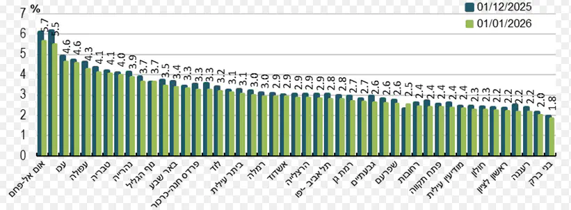 כבמרבית חודשי השנים האחרונות, גם החודש הובילו את הרשימה אום אל פחם ורהט (5.7% ו-5.5%, בהתאמה), כשאחריהן גם החודש היו עכו (4.6%) ועפולה (4.3%), שהייתה לעיר היהודיות בעלת שיעור דורשי העבודה הגבוה ביותר.