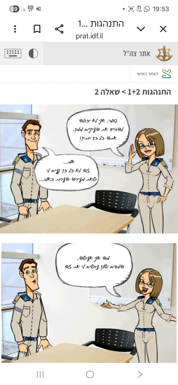 תגובת דובר צה"ל: "הלומדות המוצגות אינן תקפות. במסגרת עבודת מטה נרחבת הושקו במהלך שנת 2025 לומדות חדשות ומעודכנות המותאמות לאוכלוסיות השונות בצה"ל, בניהן לומדה ייעודית מותאמת לאוכלוסייה הדתית הנקראת 'קדושת השפה והגוף'. מטרת הלומדות היא ללמד לזהות התנהגויות בלתי הולמות בהקשר מיני, כדי להבטיח סביבה בטוחה ומכבדת לכלל המשרתים בצה"ל. ההסברה נועדה בכדי לאפיין אווירה מטרידה, בכדי שכלל המשרתים יבינו איך נכון להתנהג ואילו אמירות נחשבות כהטרדה".