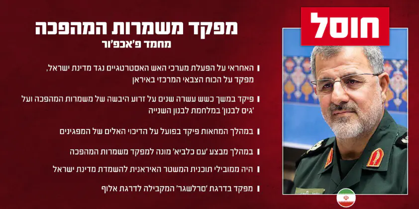 מחמד פ'אכפ'ור - מפקד משמרות המהפכה מאז מבצע 'עם כלביא' וממובילי 'התוכנית להשמדת ישראל'. במסגרת תפקידו, פיקד על הכוח הצבאי המרכזי באיראן והיה אחראי על הפעלת מערכי האש האסטרטגיים נגד מדינת ישראל ועל התמיכה וההכוונה של ארגוני הטרור הנתמכים על ידי איראן בזירות השונות. בנוסף, פיקד בפועל על הדיכוי האלים של המפגינים האיראניים במחאות הפנימיות בחודש האחרון.