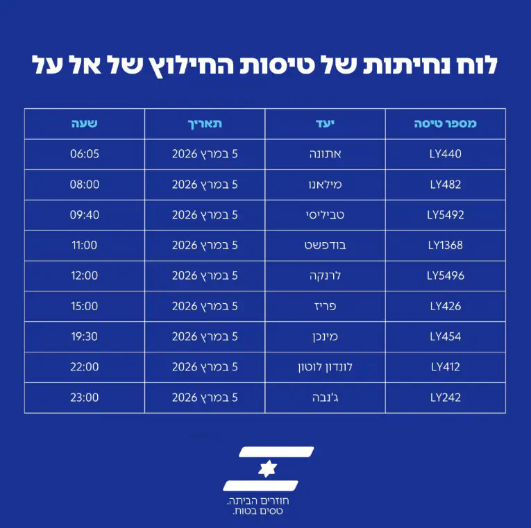 טיסת החילוץ הראשונה שצפויה לנחות בישראל היא טיסת אל על LY440 מאתונה לתל אביב, המתוכננת לנחות מחר בשעה 06:05 בבוקר.