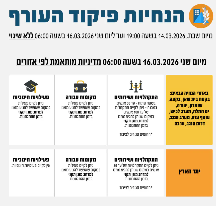 פיקוד העורף האריך הערב (מוצאי שבת) את מדיניות ההגבלות הנוכחית ללא שינוי עד יום שני הקרוב, בשעה 06:00. לא יהיו לימודים בכל הארץ, מלבד לימודים מרחוק.