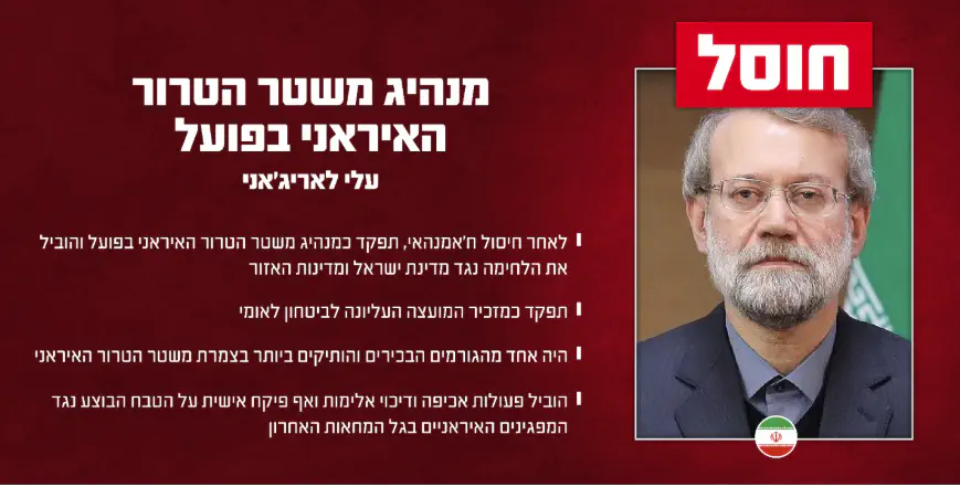 ישראל אישרה הבוקר (שלישי) באופן רשמי כי עלי לאריג'אני, מזכיר המועצה העליונה לביטחון לאומי והדמות החזקה ביותר במערך הביטחוני-מדיני של איראן, חוסל הלילה בתקיפה אווירית בטהרן "בשילוב יכולות מבצעיות ייחודיות".