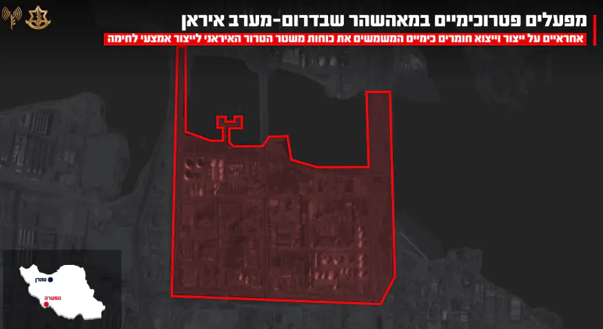 "הפגיעה בתשתיות אלו תשבש את יכולתו של המשטר להשתמש בחומרים המיוצרים במפעל לייצור אמצעי לחימה מסוגים שונים המיועדים לפגיעה במדינת ישראל ובמדינות נוספות במזרח התיכון. התקיפות שהושלמו הינן חלק משלב העמקת הפגיעה במערכי הליבה של משטר הטרור האיראני ויסודותיו".