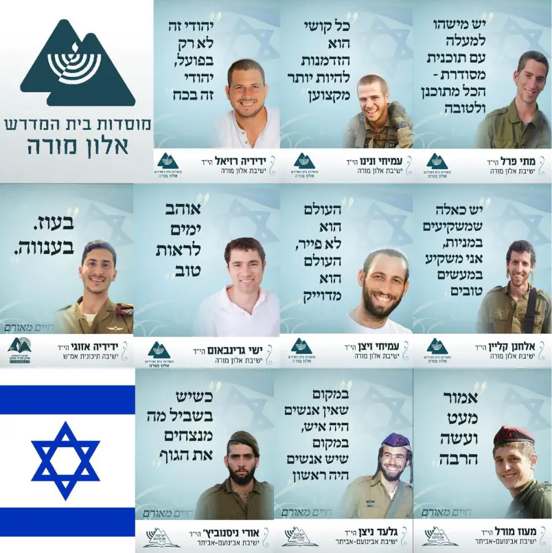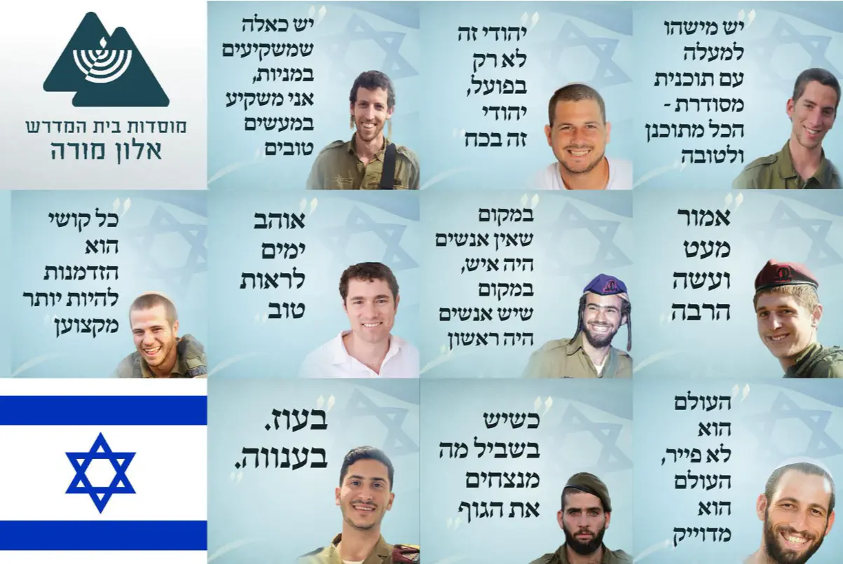 זוכרים את הנופלים: בישיבת ההסדר אלון מורה פרסמו היום (שלישי), עם ציון יום הזיכרון, שורת ציטוטים שכתבו תלמידי ובוגרי הישיבה שנפלו במהלך המלחמה, לפני נפילתם.
